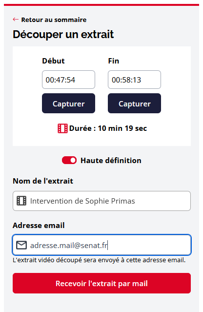 La procédure de découpe et de téléchargement d’extraits est identique sur la version mobile de la vidéothèque du site du Sénat.