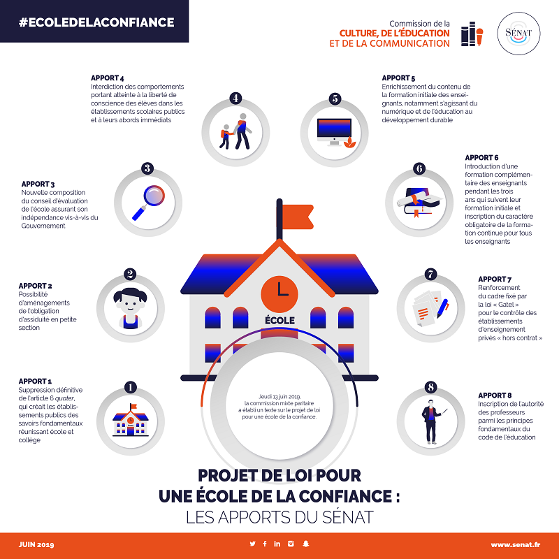 Vendredi 26 juillet 2019, le Président de la République a promulgué la loi n° 2019-791 pour une école de confiance. Elle est parue au Journal officiel n° 0174 du 28 juillet 2019.