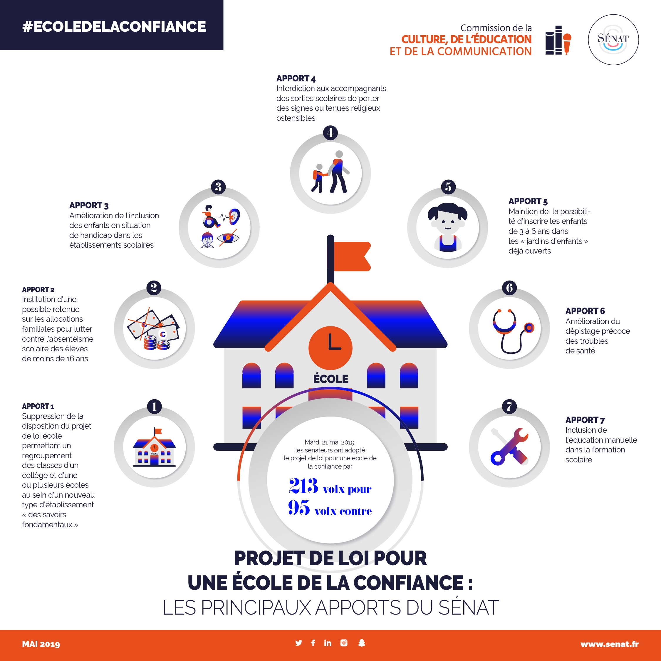 Vendredi 17 mai 2019, le Sénat a achevé l’examen des articles du projet de loi pour une école de la confiance près avoir adopté 60 amendements sur les 508 déposés.