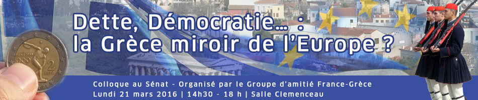 Lundi 21 mars 2016, un colloque intitulé « Dette, Démocratie … : la Grèce miroir de l’Europe ? » organisé par le groupe interparlementaire d’amitié France-Grèce du Sénat, sous la présidence de M. Luc Carvounas, Sénateur du Val-de-Marne et Président du groupe interparlementaire d’amitié France-Grèce, s’est tenu au Palais du Luxembourg.