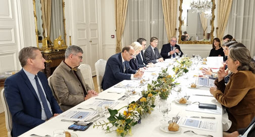 Le mardi 18 octobre 2022, le groupe d’amitié France-Saint-Siège, présidé par M.Dominique de LEGGE (Les Républicains ‑ Ille-et-Vilaine), s’est entretenu avec Mme Anne VENTALON (App. LR – Ardèche) et M. Pierre OUZOULIAS (Communiste républicain citoyen et écologiste – Hauts-de-Seine), auteurs d’un rapport sur l’état du patrimoine religieux au nom de la commission des Affaires culturelles, ainsi que Mgr Jacques HABERT, évêque de Bayeux et Lisieux, Mgr Hugues de WOILLEMONT, secrétaire général de la Conférence des évêques de France (CEF), le P. Gautier MORNAS, directeur du département d’art sacré de la CEF, et Mme Charlotte CHAMBOUNAUD, chargée des relations institutionnelles de la CEF.