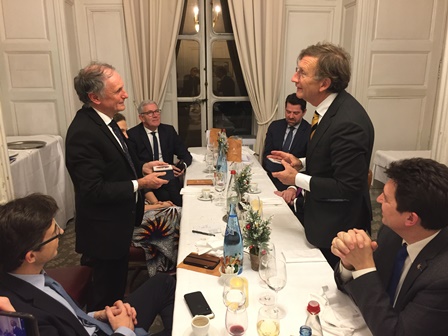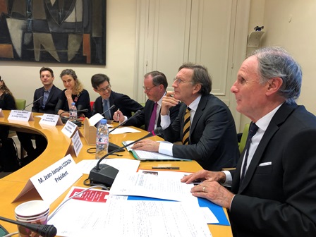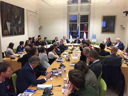 Au nom du président de la Première chambre des États généraux des Pays Bas, M. Jan Anthonie BRUIJN, qu’il est venu représenter, M. Joris BACKER a décrit le rôle de cette assemblée parlementaire et a souligné l’intérêt qu’il y avait à pleinement utiliser le canal interparlementaire de dialogue que constitue le groupe d’amitié pour faire progresser la connaissance mutuelle des deux pays qui, jusqu’alors, privilégiaient plus naturellement leur relation respective avec l’Allemagne et le Royaume-Uni. Dans le contexte du « Brexit » et de la montée des tensions internationales, les ambassadeurs des deux pays, MM. Pieter de GOOIJER et Luis VASSY, ont dressé un panorama croisé de la coopération bilatérale en mettant en exergue un exemple culturel emblématique – l’achat commun par le musée du Louvre et le Rijksmuseum de peintures de Rembrandt – et en citant l’intensification des convergences d’intérêts économiques, mais aussi politiques. À cet égard, Mme Sonja JANMAAT et M. Thomas PERRIN ont illustré la coopération franco-néerlandaise dans le domaine universitaire par l’exemple du collège néerlandais, dont la construction au sein de la cité internationale universitaire de Paris remonte à 90 ans, et du réseau franco-néerlandais de l’enseignement et de la recherche, soutenu par l’université de Lille.