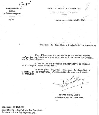Courrier du 1er avril 1949 portant fondation, au sein du Conseil de la République,