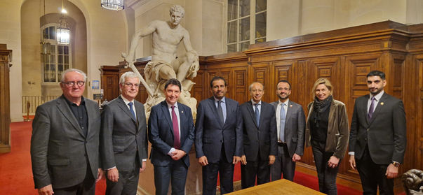 De gauche à droite : MM. Pierre Médevielle, Hervé Maurey et Olivier Cadic, S.E. M. Ghazi Alrawas et S.E. M. Fahad Al Ruwaily, M. Sheikh Nasser Al Khalifa, Mme Nathalie Delattre et M. Ahmad Almulla