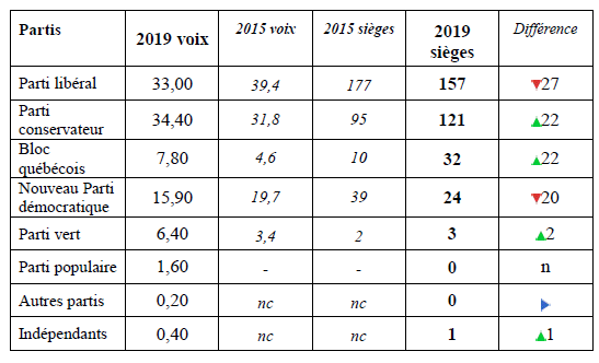 Les conservateurs ont progressé en voix par rapport à 2015 mais ont échoué à gagner les élections notamment en raison de la faiblesse du leadership de M. Andrew Sheer.