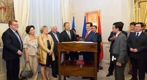 Cette visite avait été précédée de la signature d’un accord de « partenariat stratégique », le 25 septembre, par le Premier ministre vietnamien, M. Nguyen Tan Dung, en visite officielle à Paris. Celui-ci a été convié au Sénat par son Président, M. Jean-Pierre Bel, à une audience, suivie d’un dîner officiel auxquels ont participé M. Christian Poncelet, président du groupe d’amitié France-Vietnam, Mme Christiane Kammermann, vice-présidente, MM. Nicolas Alfonsi, Philippe Madrelle, vice-présidents, M. Vincent Eblé, et Mme Marie-Christine Blandin. Lors de cette réception, M. Jean-Pierre Bel s’est félicité des relations anciennes entre le Vietnam et la France. Les deux parties ont convenu de la nécessité de les développer encore davantage dans les domaines économique et culturel, la France ayant vocation à être la « porte d’entrée » du Vietnam dans l’Union européenne, et le Vietnam la « porte d’entrée » de la France dans l’Association des nations d’Asie du Sud-Est (ASEAN). A cette occasion, M. Nguyen Tan Dung a invité M. Jean-Pierre Bel à se rendre en visite officielle au Vietnam.