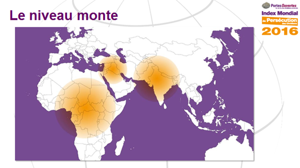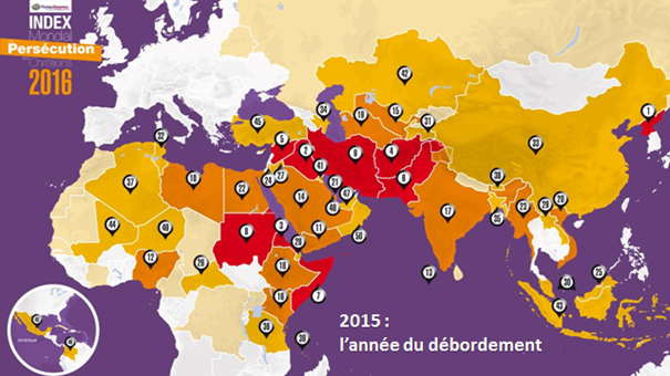 S’il y a débordement c’est bien évidemment que le niveau de la persécution augmente. Pour cela il suffit de regarder l’augmentation du seuil d’entrée dans la liste des 50 pays que publie l’Index. Le seuil d’entrée est de 53 points, en augmentation de quatre points en un an. Sur ces 50 pays, 36 connaissent une augmentation, sept sont stables et sept seulement connaissent une baisse du nombre de points.