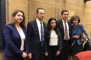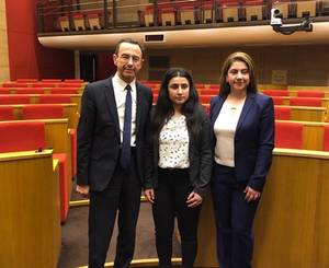 | De gauche à droite, Mme Rosa Akar, M. Bruno Retailleau, Mme Ramia Daoud, M. Ali Dolamari, représentant à Paris du Gouvernement Régional du Kurdistan irakien, et Mme Jacky Deromedi | De gauche à droite, M. Bruno Retailleau, Mme Ramia Daoud et Mme Rosa Akar |