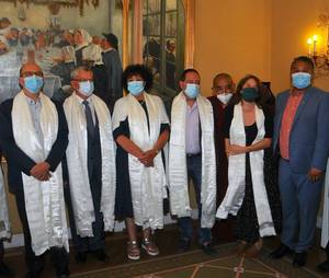 Michel Raison, entouré à gauche d' André Gattolin, à droite de Mme Eustache-Brinio, M. Jean-Luc Roméro, adjoint à la Mairie de Paris, en charge des droits humains, de l'intégration et de la lutte contre les discriminations et Mme Eugénie Gangnet (Cheffe de Cabinet), MM. Tenzin Penpa (Président de la Communauté tibétaine) et Namgyal Sandhup (Bureau du Tibet).