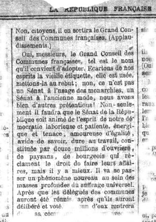 (…) Voyez ces communes éveillées à la vie politique, se groupant, se réunissant, se renseignant, s’informant, délibérant, déléguant leurs hommes ; ceux-ci s’assemblant au chef-lieu du département, faisant prévaloir leurs volontés, lesquelles seront, le jour de l’élection, ce qu’elles auront été la veille. Après la délibération commune, que va-t-il sortir des urnes ? Un Sénat ? Non, citoyens, il en sortira le Grand Conseil des Communes françaises. (Applaudissements).
