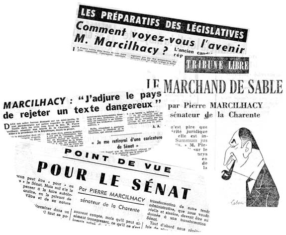 Après avoir été élu conseiller général de Jarnac, canton représenté par sa famille depuis 1852, Pierre Marcilhacy est élu en 1948 conseiller de la République en Charente.