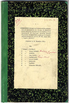 Pendant la première guerre mondiale, les commissions chargées d'examiner les projets et propositions de loi étaient, dans la plupart des cas, constituées dans les conditions prévues aux articles 13 et 14 du règlement de 1903 : chacun des neufs bureaux désignait un membre. Les neufs bureaux étaient eux-mêmes « renouvelés chaque mois, en séance publique, par la voie du sort ». La primauté des commissions spéciales jusqu'à la fin de la IIIème s'explique, selon Eugène Pierre, par les mauvais souvenirs laissés par les comités des assemblées révolutionnaires, organes « ayant pour mandat d'étudier un ensemble de questions » sans être limités, comme les commissions spéciales, à « un ou plusieurs projets déterminés ». Le plus célèbre de ces comités fut le Comité de salut public. Dans les archives du Sénat, la sous-série 124S, au sein de laquelle sont cotés les procès verbaux des commissions spéciales de la IIIème République , comprend 124 registres pour les années 1915-1918. | |
