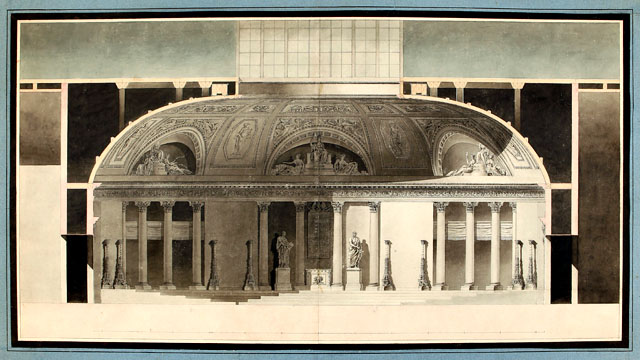 Ce projet de Chalgrin préfigure l’hémicycle de la salle des Séances du côté de la tribune de l’orateur. Derrière elle, la plaque d’Elchingen retranscrit une lettre envoyée par Napoléon aux sénateurs, accompagnée de 40 drapeaux pris à l’ennemi autrichien en 1806.