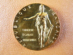 Médaille d'identité du Sénat de la Cinquième République, 1977 (or). A/ REPUBLIQUE FRANCAISE. La République en marche, de face, drappée et coiffée d'un bonnet phrygien. Dans le champ : LIBERTE, EGALITE, FRATERNITE. R/ SENAT. La salle des séances du Palais du Luxembourg. Devant un insigne de sénateur de la Cinquième République, un cartouche destiné à recevoir le nom du parlementaire. De part et d'autre du cartouche, l'inscription : 1977 (petit module) (var. Di Stefano, p. 103). 1977.