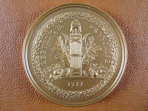 Médaille d'identité du Sénat de la Troisième République, 1927 (bronze). A/ REPUBLIQUE FRANCAISE. Exergue : 1927. Dans une couronne de chêne sans fin, le faisceau républicain, surmonté du bonnet phrygien ceint d'une couronne d'olivier, dressé entre deux cornes d'abondance, laissant échapper des fruits, et orné d'une branche d'olivier à gauche et d'une branche de chêne à droite. R/ SENAT. La façade, sur la rue de Tournon, du Palais du Luxembourg. Au-dessous, un cartouche destiné à recevoir le nom du sénateur (Di Stefano, p. 89 haut). 1927.
