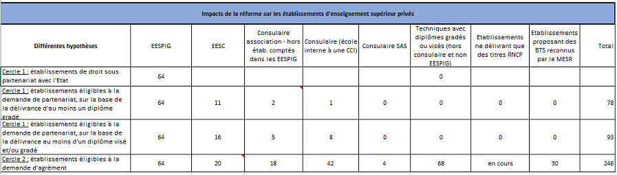 - Le renforcement de la qualité de l'enseignement : en établissant des critères clairs d'agrément et de partenariat, ainsi qu'en modernisant et en renforçant les contrôles et l'évaluation de l'ensemble des établissements de l'enseignement supérieur privé souhaitant bénéficier d'une reconnaissance de l'Etat, la réforme contribue à garantir une offre de formation supérieure privée de qualité et reconnue. Cela favorise la confiance des étudiants, des familles et des employeurs dans les diplômes délivrés.