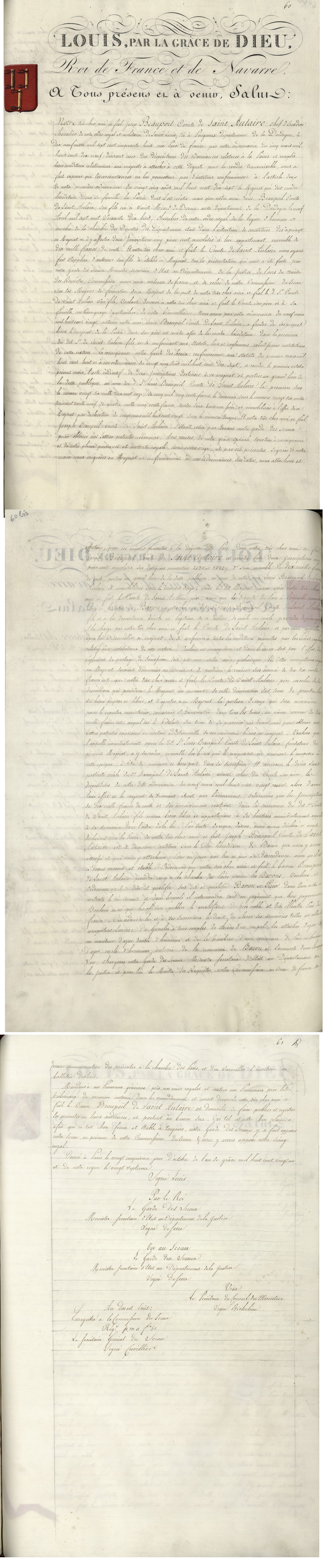- Lettres patentes (institution d'un titre de Pairie) extraites du "Livre de la Pairie" [Archives nationales CC//961]