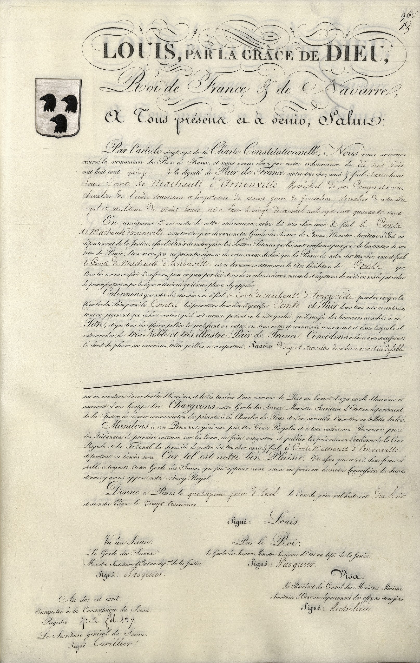 - Lettres patentes (institution d'un titre de Pairie) extraites du "Livre de la Pairie" [Archives nationales CC//960]