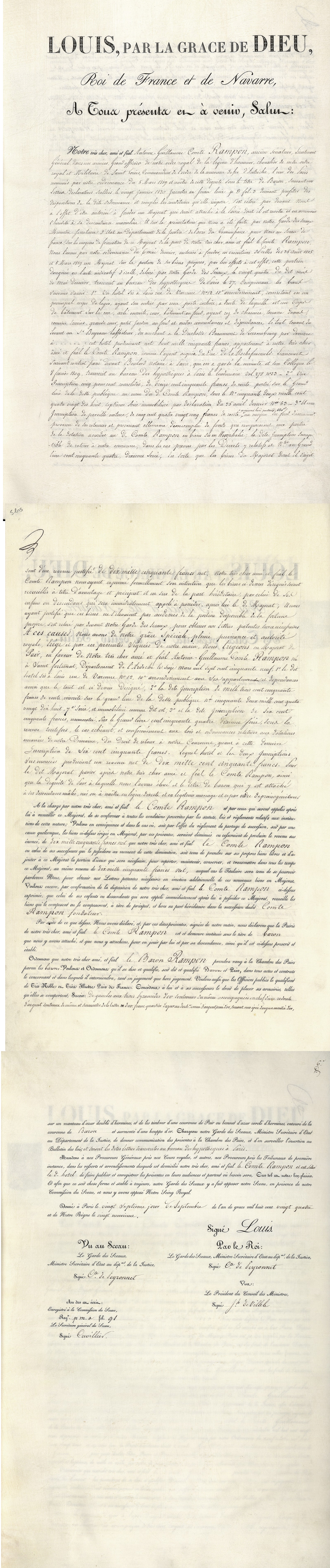 - Lettres patentes (institution d'un titre de Pairie) extraites du "Livre de la Pairie" [Archives nationales CC//961]