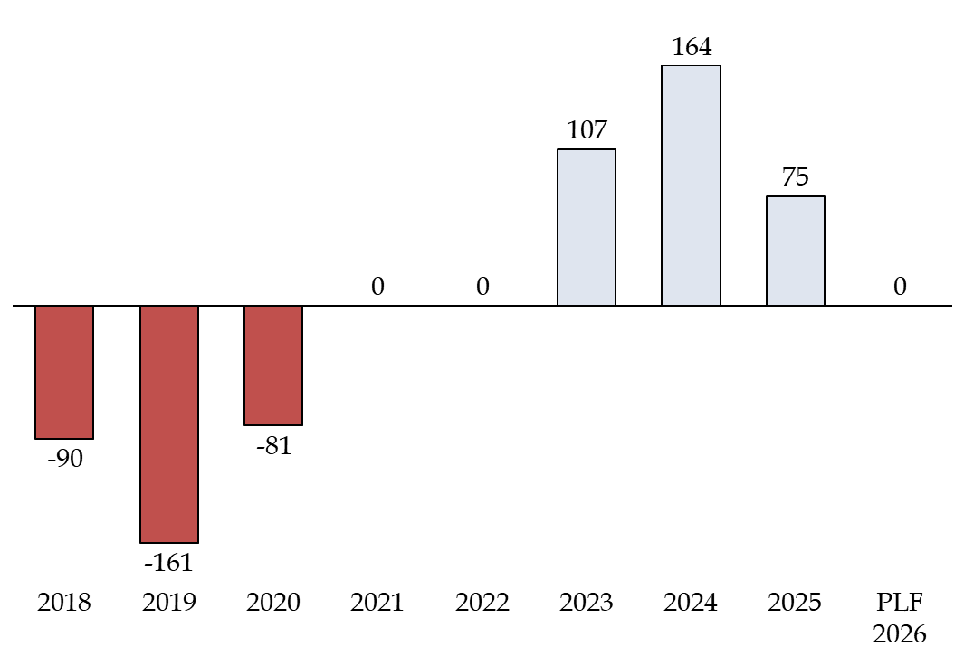 Aucune création d'ETP n'est prévue pour l'année 2026. Toutefois, l'extension en année pleine du schéma d'emplois 2025 sur 2026, avec la création de 75 nouveaux ETP, aura un impact budgétaire de l'ordre de 4,26 millions d'euros. Ainsi, pour la première fois depuis 2021, le plafond d'emplois de la mission demeure stable : entre 2021 et 2024, le schéma d'emplois cumulé exécuté a représenté une hausse de 233 ETP.
