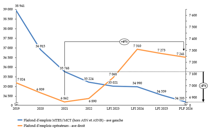 Les opérateurs de la mission voient leurs effectifs diminuer pour la première fois depuis 2021. Le plafond d'emploi des opérateurs de la mission (hors transports) demandé pour 2026 s'élève à 7 241 ETPT contre 7 273 ETPT en 2025. Toutefois, les effectifs des opérateurs restent encore en augmentation sur les cinq dernières années : ils ont progressé de 6 % entre 2021 et 2026, tandis qu'à l'inverse, le plafond d'emploi du ministère a diminué de 4 % sur la même période.