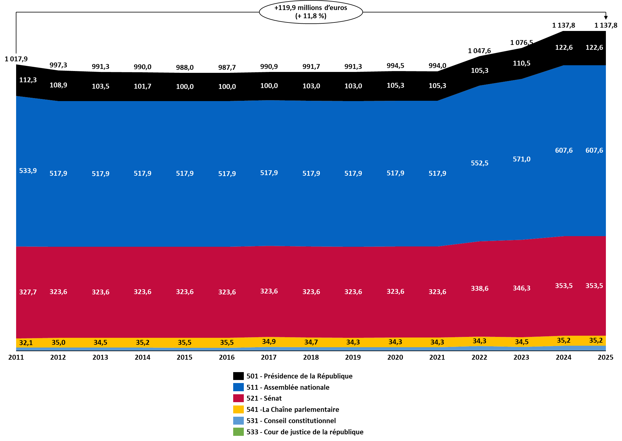 Note : en 2024, une hausse ponctuelle de la dotation de l'Assemblée nationale a par ailleurs été décidée en cours d'année à l'occasion des frais engendrés par la dissolution intervenue cette année-là, la portant à 627,18 millions d'euros.