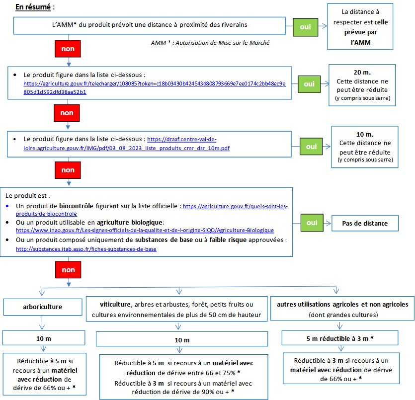 En effet, lorsque les distances de sécurité ne sont pas directement indiquées par l'Anses au sein des autorisations de mise sur le marché (AMM) qu'elle délivre, des distances forfaitaires s'appliquent, avec une gradation en fonction de la dangerosité du produit. Ces distances peuvent ainsi être, dans des conditions strictes de réduction de la dérive, réduites de 10 à 5 voire 3 mètres (selon le niveau de dérive) pour l'arboriculture, la viticulture et les autres cultures hautes, et de 5 à 3 mètres pour les cultures basses. Cet aménagement ne concerne en aucun cas les produits les plus dangereux, pour lesquels une distance incompressible de 10 ou 20 mètres est appliquée.