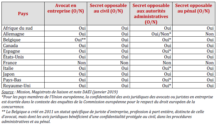 Règles de confidentialité des avis juridiques applicables aux avocats en entreprise dans les principaux pays partenaires de la France en 2019