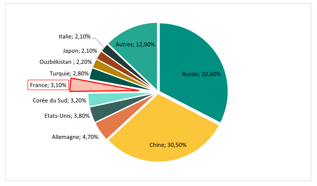 Le Kazakhstan est notamment l'un des premiers fournisseurs de pétrole brut de la France (actuellement au 3ème rang, il était le premier en 2020 et 2021).