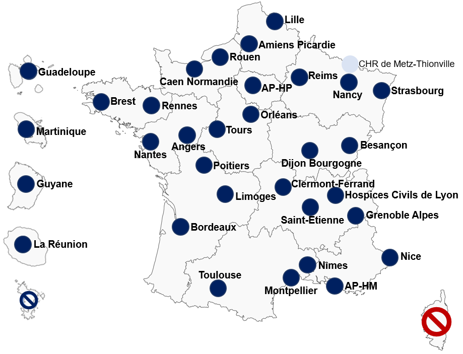 La France compte 33 CHR, dont la liste est établie par décret2(*). Tous sont désormais des CHU, hormis celui de Metz-Thionville, dont l'universitarisation est toutefois en cours, en partenariat avec l'université de Lorraine et le CHU de Nancy. En France hexagonale, le dernier CHR transformé en CHU a été celui d'Orléans, en 2023, avec la création ex nihilo d'une faculté de médecine à Orléans.