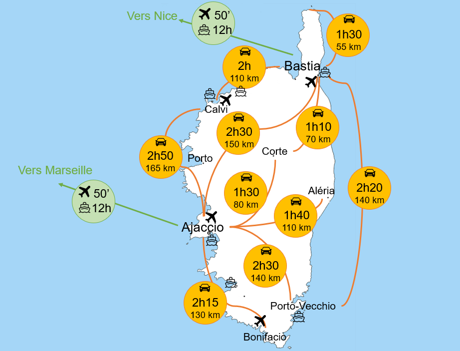 La Corse est une île-montagne, avec une dispersion des bassins de vie et des temps de transport élevés. Ces caractéristiques géographiques complexifient l'accès physique aux soins, en particulier pour les personnes âgées ou en perte d'autonomie et les publics précaires.