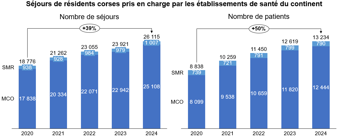 Les patients corses sont contraints de se déplacer sur le continent pour de nombreux soins spécialisés : 18 % des séjours hospitaliers de résidents corse en chirurgie et 15 % en médecine sont réalisés sur le continent.