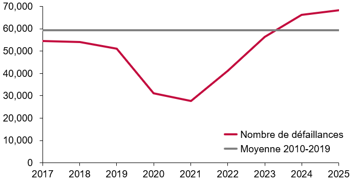 En 2025, 68 296 entreprises ont fait faillite, niveau inédit et très supérieur à la moyenne des années précédentes, puisqu'il représente une hausse de 28 % par rapport à la période antérieure à la crise sanitaire (2017 - 2019).