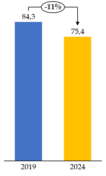 En premier lieu, la désindustrialisation tendancielle du continent européen a pour effet de réduire progressivement la demande d'acier en Europe, qui est passé de 84 millions de tonnes en 2019 à 75 millions de tonnes en 2024, soit une réduction de 11 %.