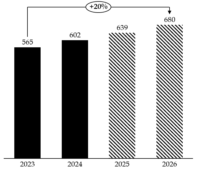 En second lieu, les prix de l'acier sur le marché européen sont affectés par le développement depuis plusieurs années d'une « surcapacité mondiale » de production, c'est-à-dire par un excès de production d'acier à l'échelle mondiale qui dépasse la demande globale à hauteur de 639 millions de tonnes de surcapacité en 2025 et même 680 millions de tonnes en 2026 d'après les estimations de la World Steel Association.