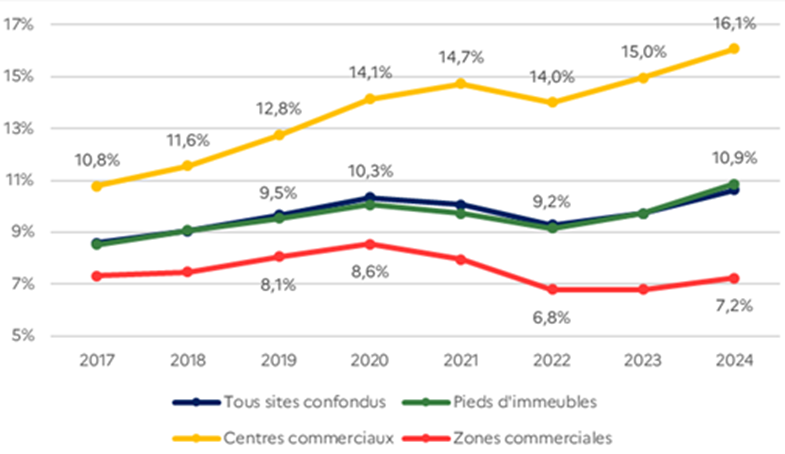 Parallèlement à la hausse des loyers, le taux de vacance commerciale en centre-ville a doublé en 20 ans, passant ainsi de 5,94 % en 2004 à plus de 10,85 % en 2024. Cette évolution illustre une dévitalisation économique qui touche désormais toutes les strates territoriales, des petites villes de la ruralité aux grandes métropoles urbaines.