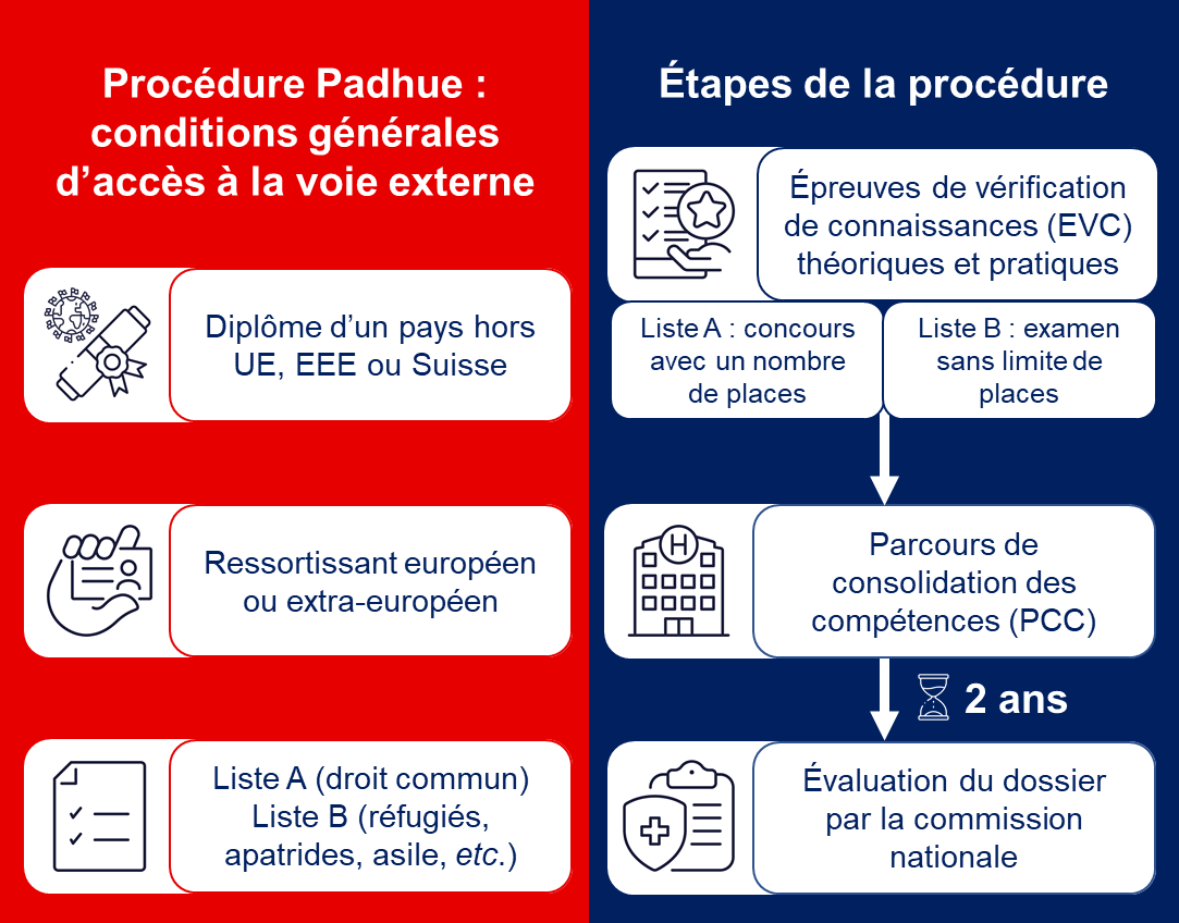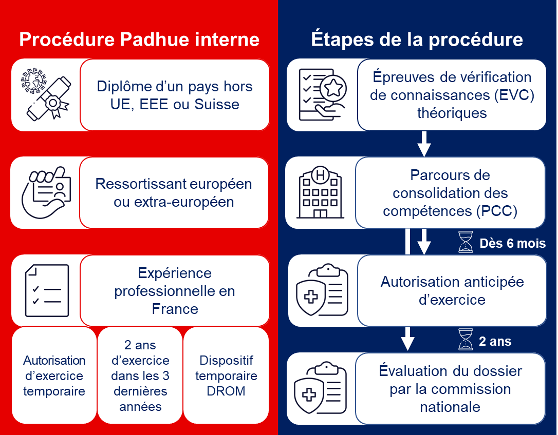 Depuis 2025, une procédure simplifiée, dite de « voie interne », est ouverte pour les médecins ayant bénéficié d'une autorisation temporaire d'exercice ou pouvant justifier de deux années d'exercice à temps plein en France au cours des trois dernières années. Sont également éligibles à ce dispositif, les Padhue ayant une autorisation temporaire d'exercice dans les départements et régions d'outre-mer, en application de l'article L. 4131 5 du code de la santé publique.