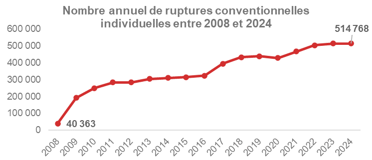 514 000 ruptures conventionnelles ont été conclues au cours de l'année 2024. Source : Dares |