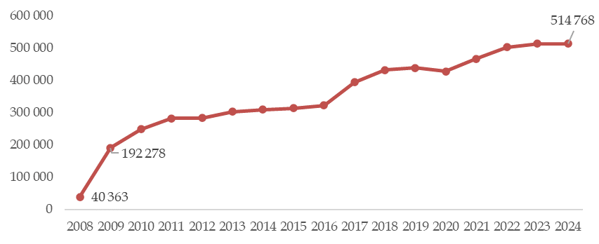 Les données de la direction de l'animation de la recherche, des études et des statistiques (Dares) révèlent un recours croissant à ce mode de rupture du contrat de travail. Alors que 192 278 ruptures conventionnelles ont été recensées en 2009, celles-ci atteignent 514 768 en 2024, soit une hausse de 167 % en 15 ans (voir graphique ci-dessous). En 2024, 41,6 % des ruptures conventionnelles avaient été effectuées dans des très petites entreprises, de 10 salariés ou moins.
