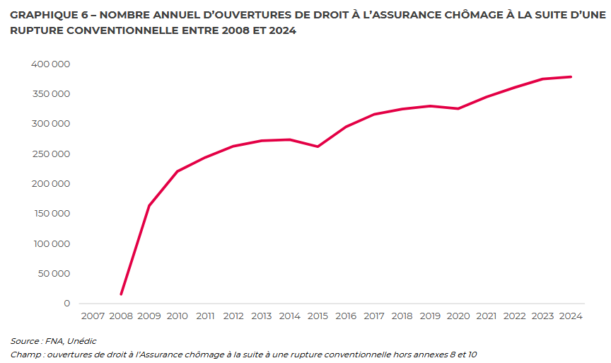 Ainsi, selon les données de l'Unédic, en 2024, sur les 514 000 ruptures conventionnelles conclues au cours de l'année, près de 375 000 (72,9 %) ont conduit à une ouverture de droits au chômage, ce qui représentait près de 19 % de l'ensemble des ouvertures de droits à l'assurance chômage. Là encore, les données depuis 2008 rendent compte d'une part en augmentation constante.