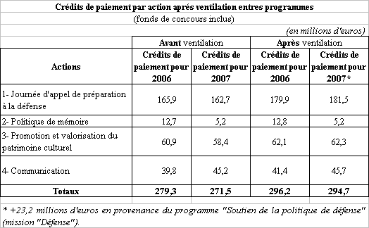 - D'ailleurs, la répartition des crédits n'est pas toujours pas respectueuse des principes de la LOLF. La part des crédits de communication intégrée dans le programme 167 continue à ne représenter que la moitié des moyens consacrés à cette fonction par le ministère de la défense. Surtout les crédits de mémoire sont toujours éclatés dans deux programmes : dans le programme 167 ceux concernant l'édification de monuments et dans le programme 169 ceux qui sont destinés à leur entretien (voir le développement de votre rapporteur spécial, sur son contrôle portant sur les lieux de mémoire, dans ses commentaires de présentation du programme 169).