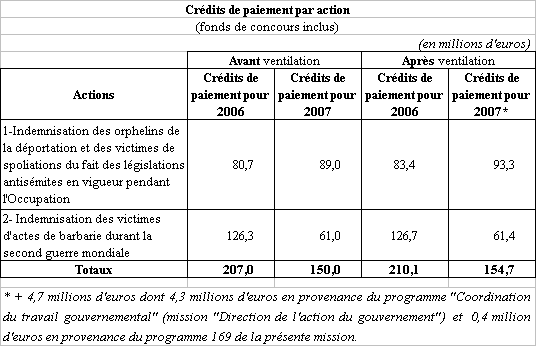 Les crédits du programme 158, pour 2007, diminuent à 147 millions d'euros en crédits de paiement, après 207 millions d'euros en 2006, où ils avaient été quasiment doublés pour répondre à la pleine entrée en application de la réparation prévue par le décret du 27 juillet 2004.