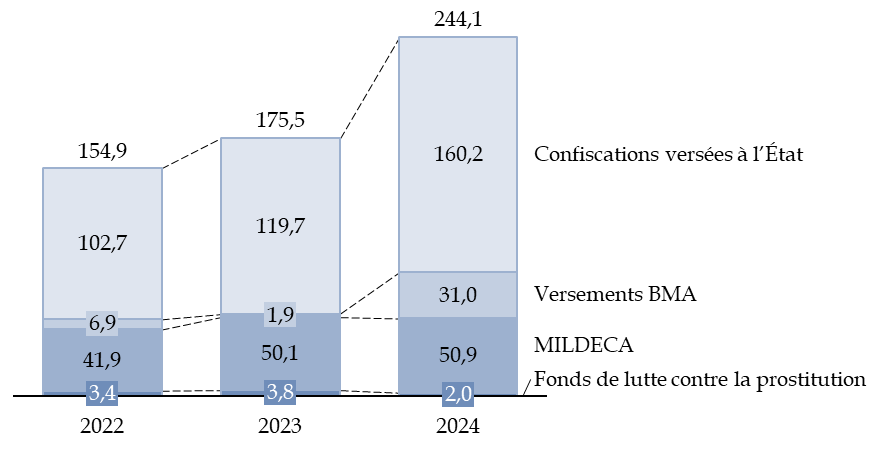 Le produit total des confiscations a été de 255,1 millions d'euros en 2024, dont 160,2 revenant au budget général de l'État. Le reliquat a les usages suivants :