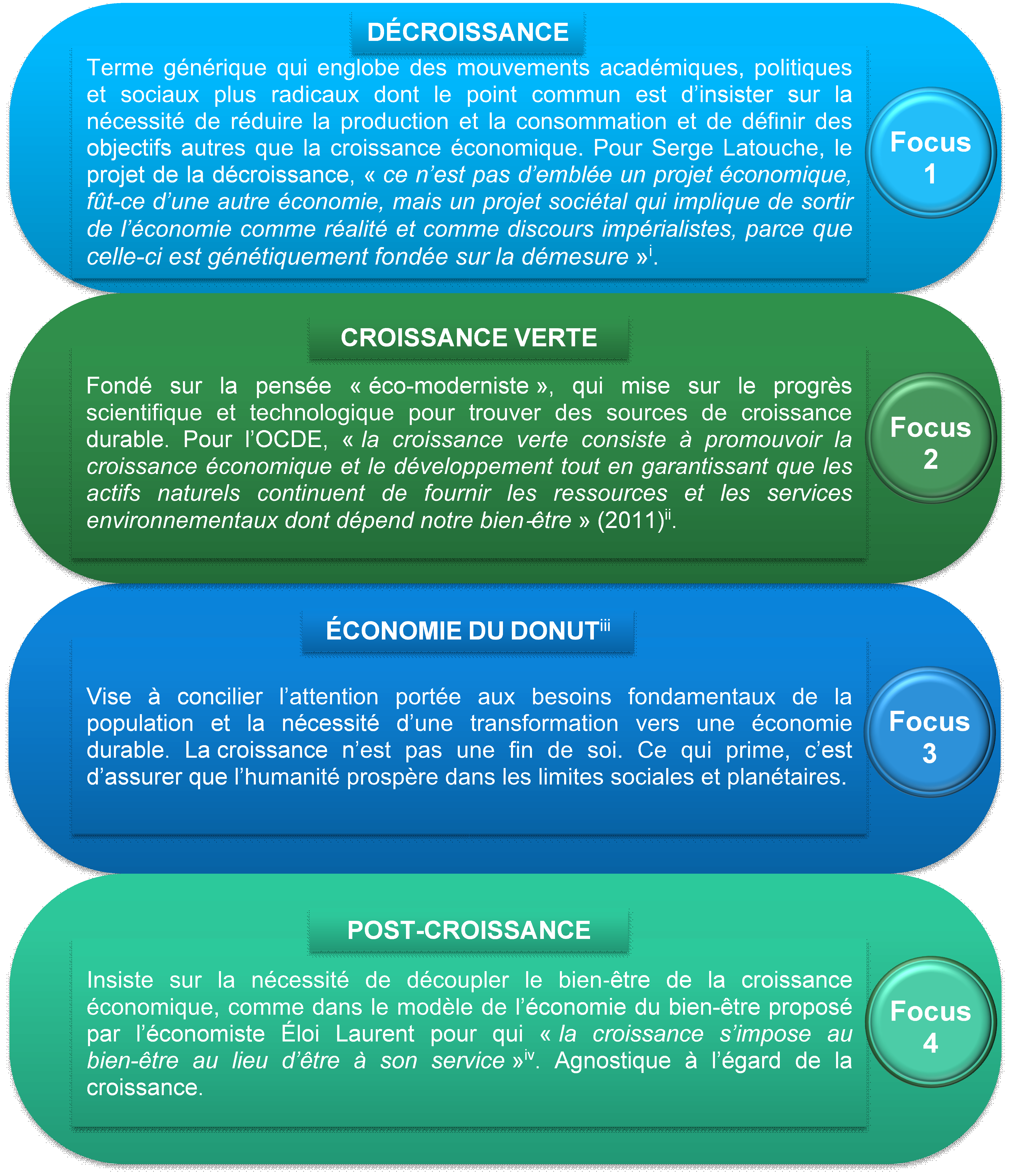 i Serge Latouche, La décroissance, Que Sais-je ? 2024 ; ii OCDE, « Fostering Innovation for Green Growth », 2011 ; iii Kate Raworth, « Doughnut economics : seven ways to think like a 21st-century economist », Chelsea, Green Publishing, 2017 ; iv Op. cit.