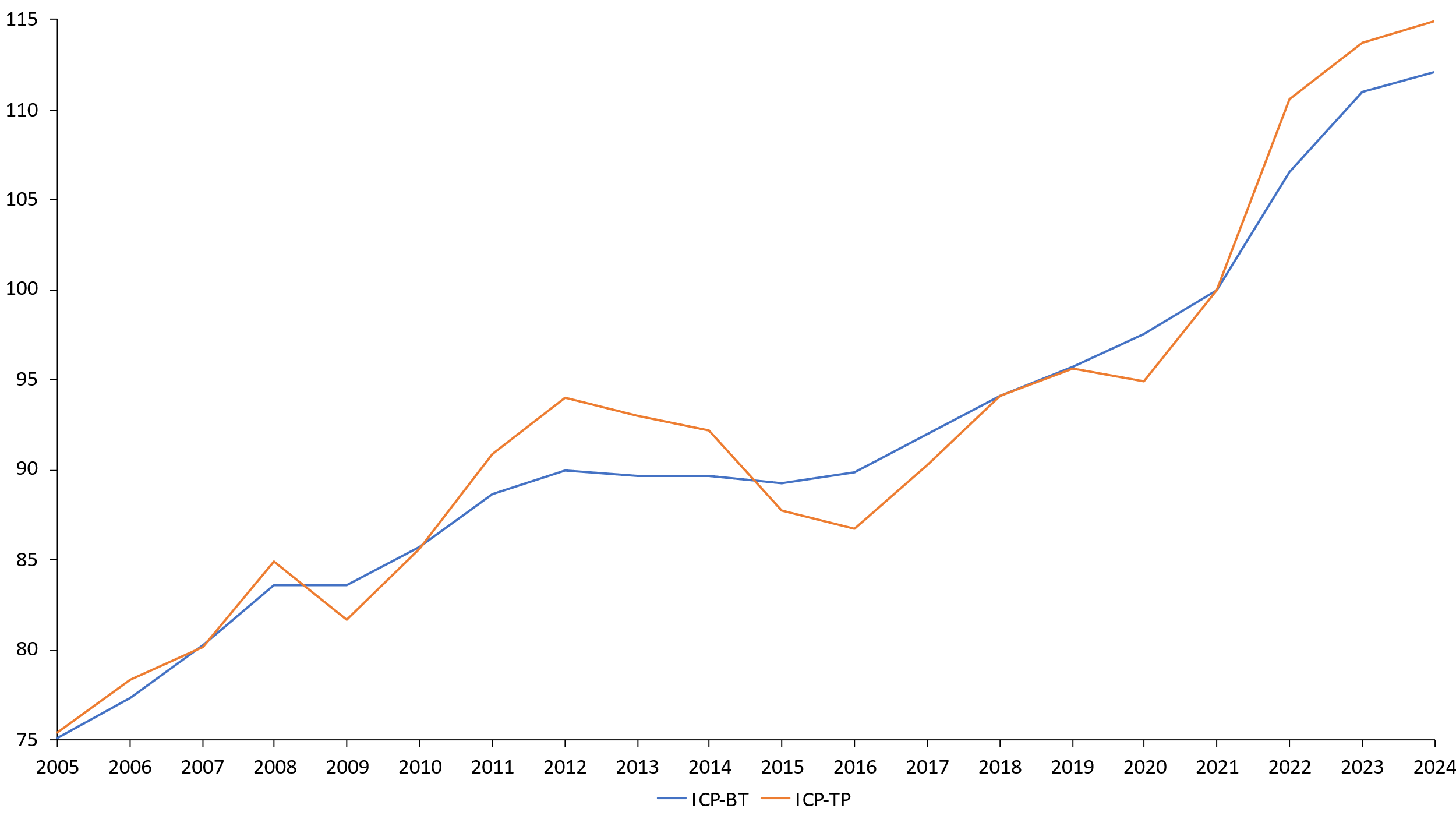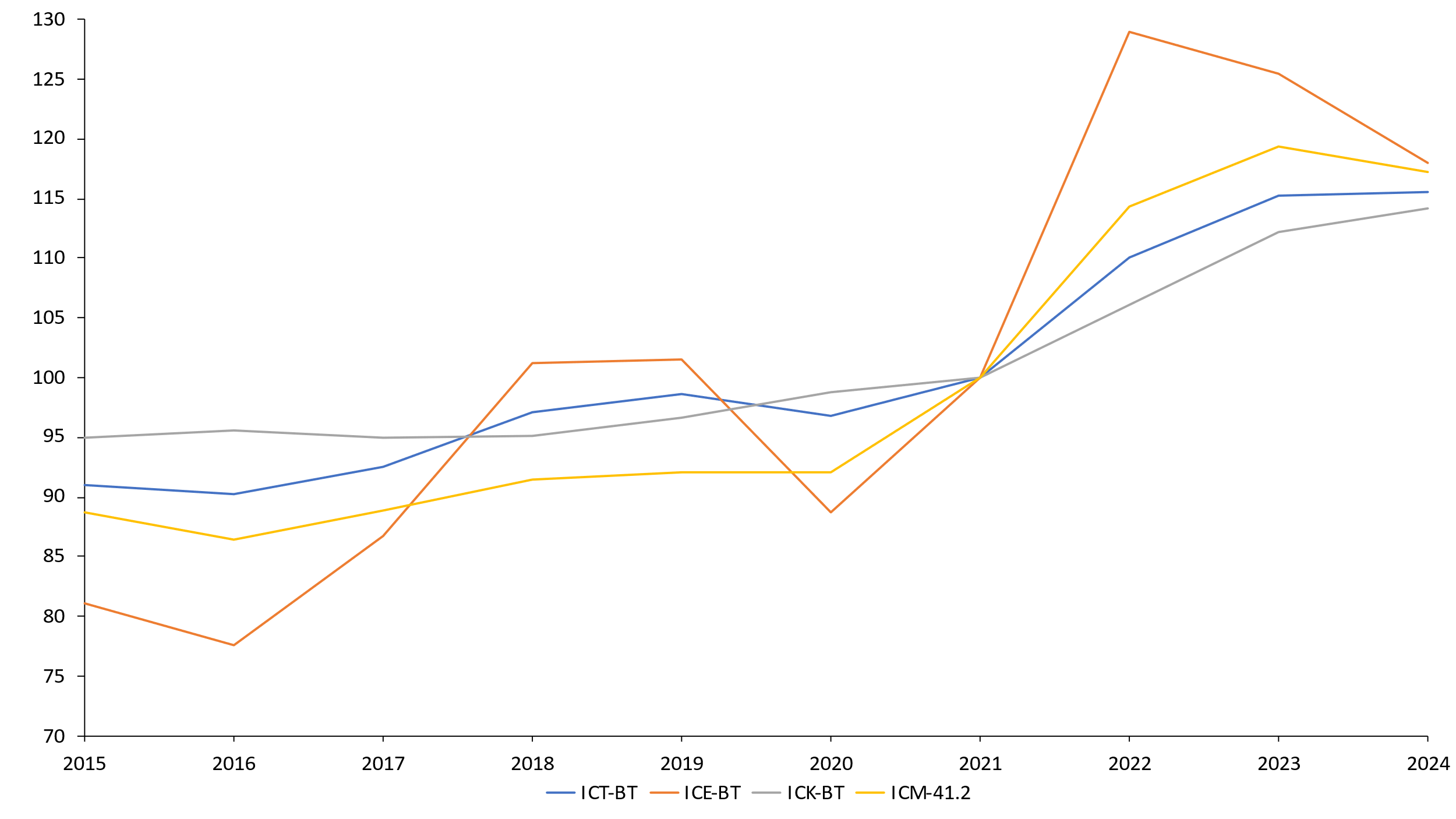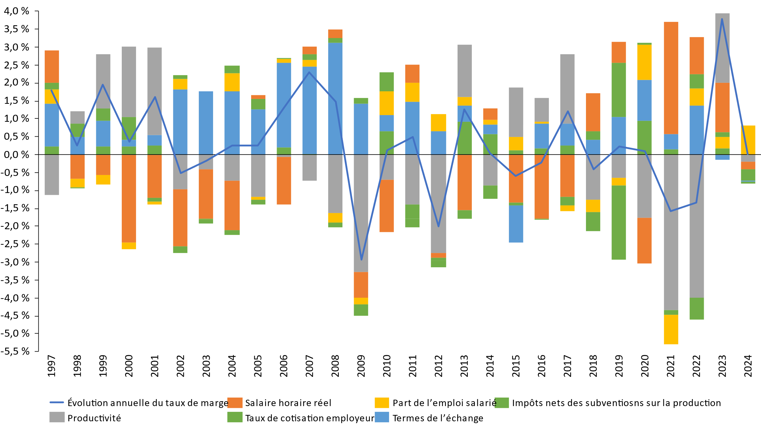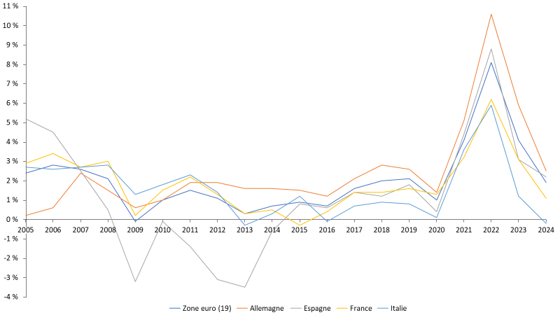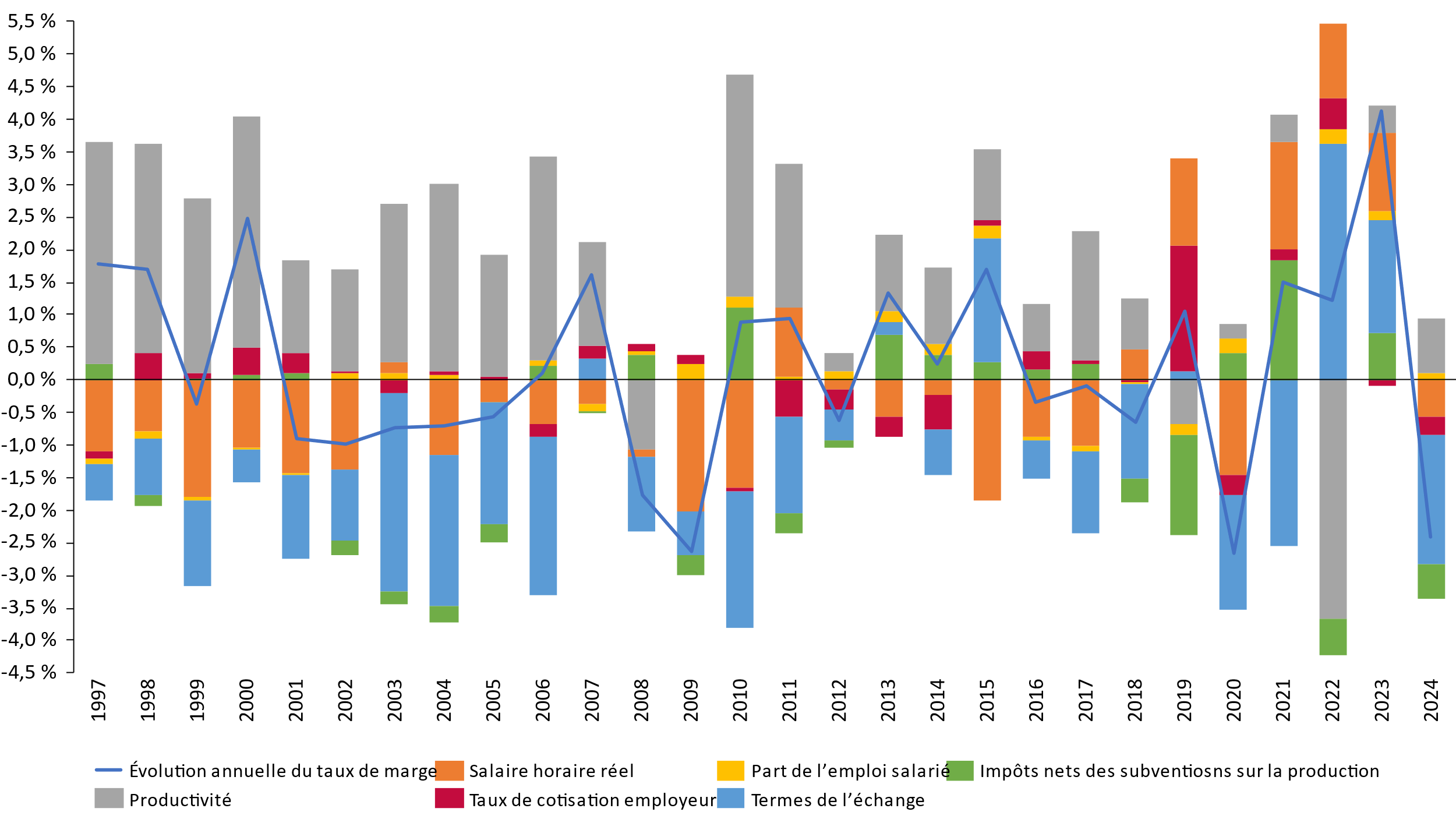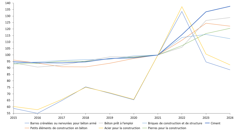 * 5 Les coûts de l'énergie ont progressé en moyenne de 5 % par an entre 2005 et 2024, pour une augmentation totale de 45,3 %, marquée par deux années de forte hausse en 2021 (12,7 %) et en 2022 (28,9 %) ; les coûts des matériaux ont également progressé avec vigueur, en moyenne de 3,3 % par an, pour une évolution totale de +32,3 %, également marquée par deux années de forte hausse en 2021 (8,7 %) et en 2022 (14,3 %).