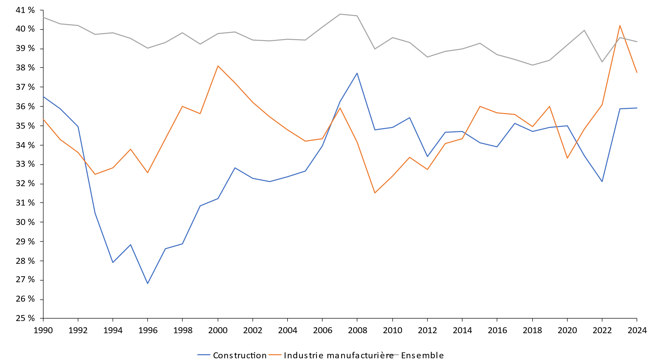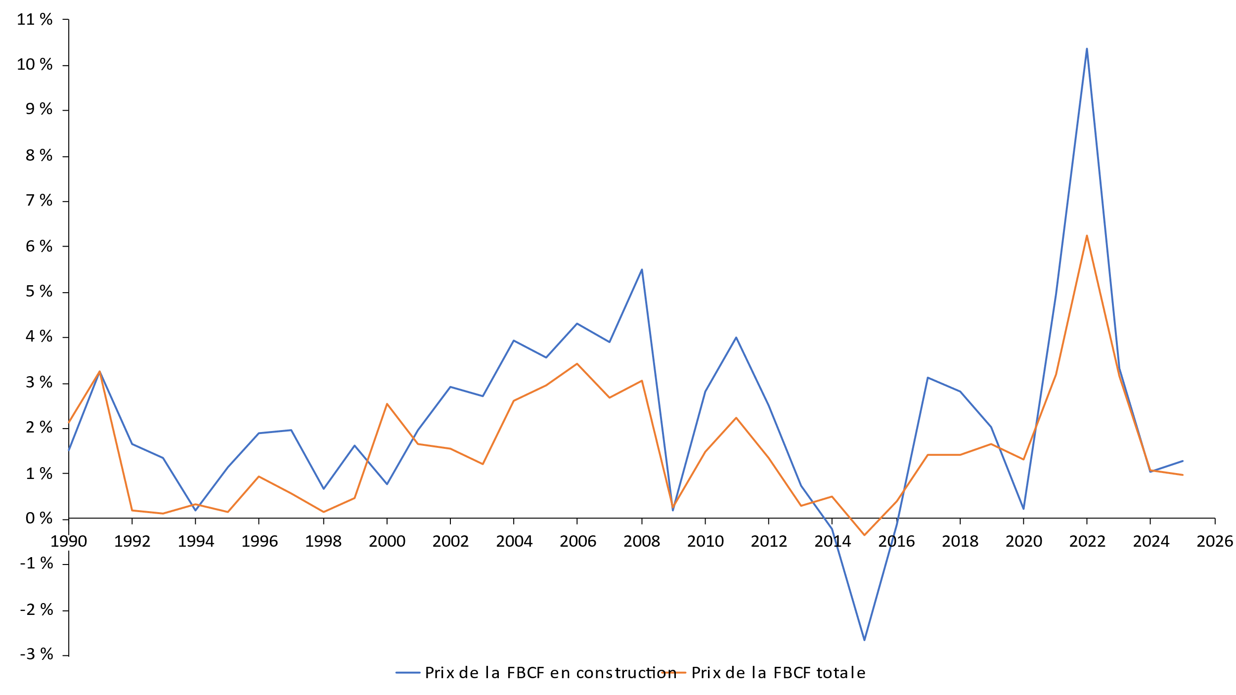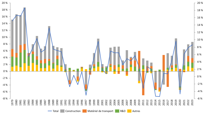 * 7 En comptabilité, l'investissement est mesuré par la formation brute de capital fixe (FBCF), constitué par les acquisitions nettes d'actifs fixes par les producteurs (logements, bâtiments et ouvrage de génie civil, machines et équipements, systèmes d'armes). La FBCF en construction représente environ 60 % de l'ensemble de la FBCF sur la période 1978-2023 : la FBCF en construction est ainsi le premier poste d'investissement devant la recherche et développement scientifiques (22 %), les matériels de transport (8 %) et les activités informatiques et services d'information (5 %).