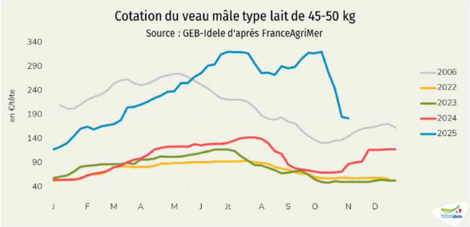 * 9394 « Les prix toujours en hausse », bulletin de tendances lait viande de l'Idele n° 376, octobre 2025.