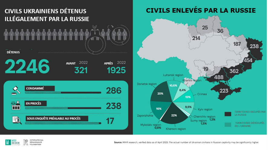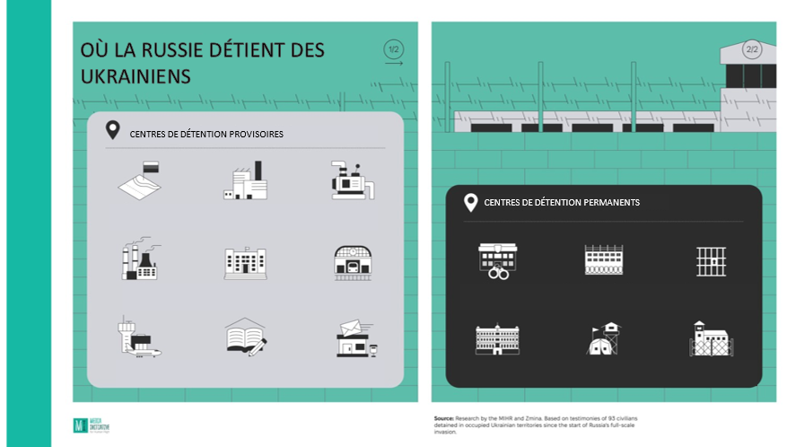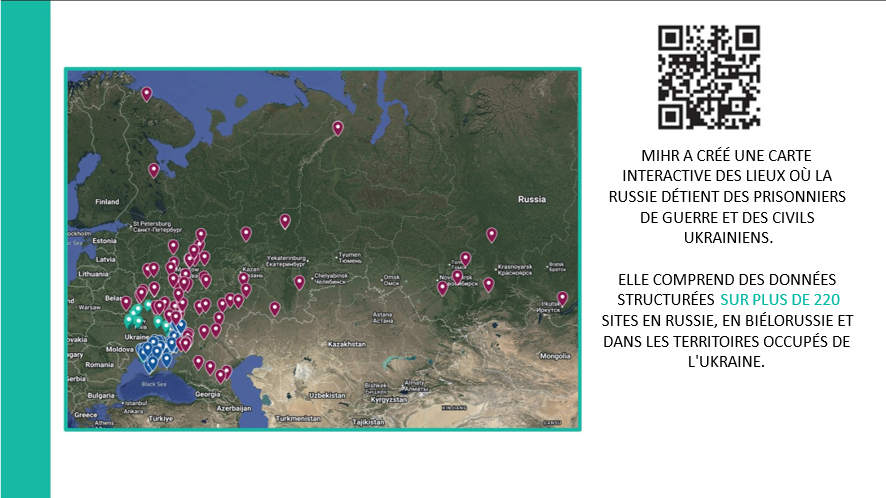 Comme vous le voyez, nous avons recensé 2 246 civils enlevés par la Russie. Nous actualisons également régulièrement la carte que vous avez sous les yeux, qui répertorie les endroits où des Ukrainiens ont été détenus avant d'être libérés par l'armée ukrainienne, ainsi que les centres de détentions partout en Russie et dans les territoires occupés. À l'heure actuelle, nous avons connaissance de 220 centres de détention dans lesquels ont été placés des prisonniers de guerre et des civils ukrainiens.