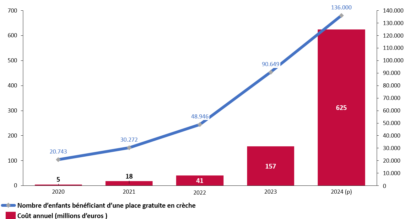 Dans un premier temps, seuls les enfants des familles à plus faibles revenus pouvaient bénéficier de la mesure et uniquement au sein du réseau associatif. Le 1er septembre 2022, la gratuité a été étendue à tous les enfants nés après le 1er septembre 2021. En janvier 2023, le programme est étendu aux crèches privées lucratives et, en janvier 2024, à toutes les crèches publiques. Entre 2020 et 2023, le nombre d'enfants bénéficiaires est passé de 20 473 à 90 649, tandis que le coût annuel a été multiplié par plus de 30 (de 5 millions d'euros à 156,6 millions d'euros). Le dispositif repose aujourd'hui sur un financement identique dans l'ensemble du pays d'environ 500 euros par enfant et par mois13(*) (473,80 euros en 2024). Cette somme est directement versée aux établissements d'accueil. La ministre du Travail a pu confirmer qu'il s'agissait d'un programme ambitieux dont le coût en 2024 était évalué à près de 700 millions d'euros14(*), soit 0,24 % de son PIB.