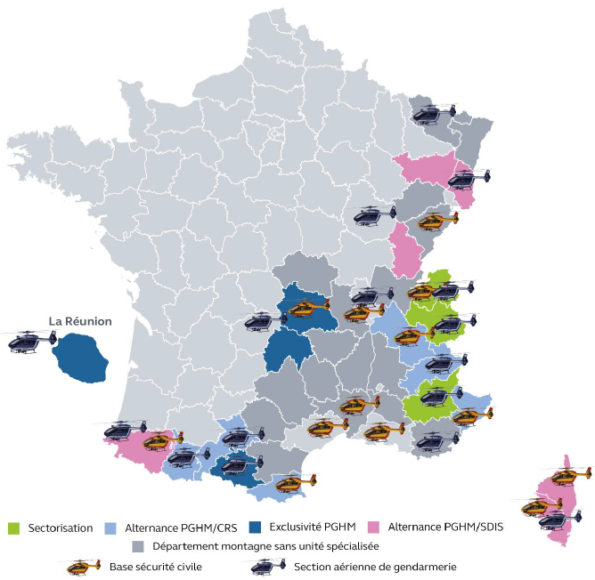 * 23 Base de Grenoble et son détachement hivernal à l'Alpe d'Huez ; base d'Annecy, son détachement permanent de Chamonix et son détachement estival de Courchevel ; base de Pau et, jusqu'en 2022, son détachement estival à Gavarnie.